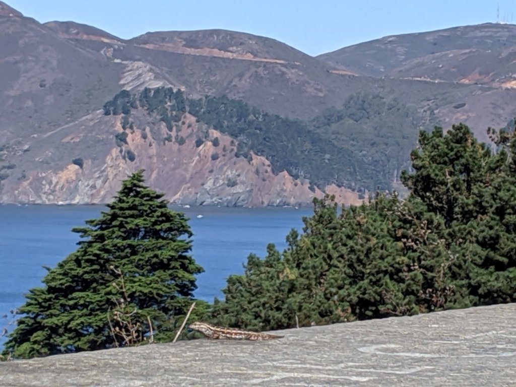 If that means doing things like discovering a tiny lizard on the low concrete wall at Immigration Point Overlook in the Presidio and taking the time to get the perfect shot with the Marin Headlands in the background, then I’m doing it right!