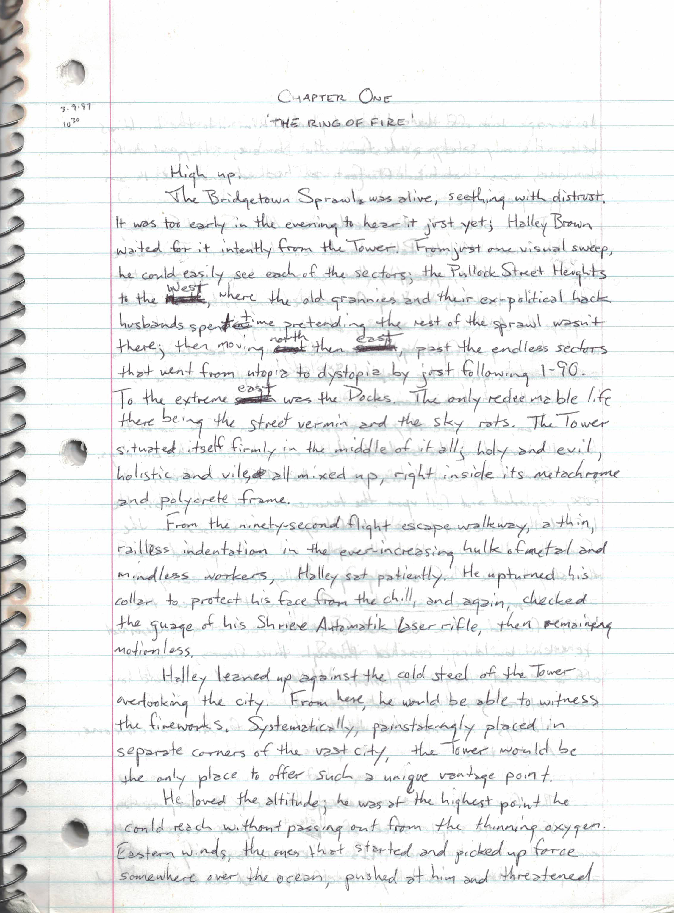 I’m scanning a chapter at a time into pdf form and saving it to my Dropbox, considering that’s the safest route. I may even eventually scan the completed typed version, which currently only exists as inaccessible MS Write files. This first chapter was surprisingly long at nineteen handwritten pages, and I’m pretty sure the first five or so were rewritten from an earlier and much rougher draft (probably no earlier than a few weeks at most) that must be kicking around somewhere.