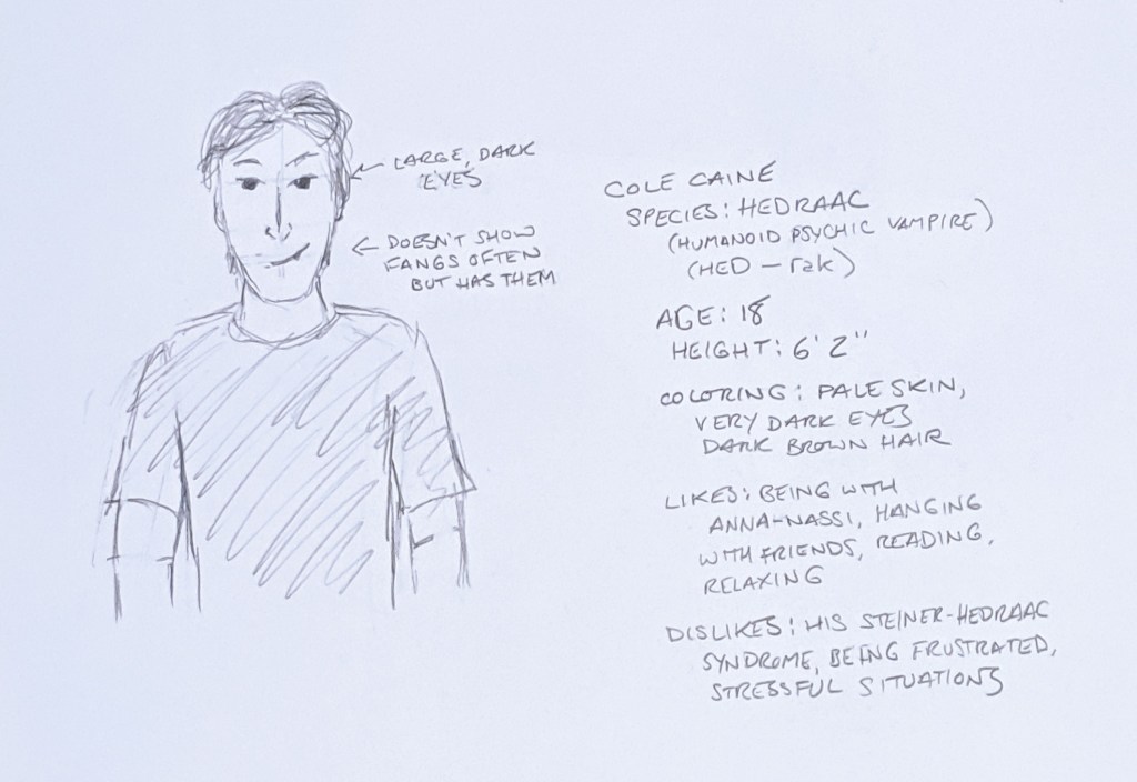 And last but not least, we have Cole, a hedraac (a humanoid vampire with clairsentient abilities). He’s often the Straight Man character to Anna-Nassi’s silliness, but he’ll also sneak out a devastating zinger when you least expect it. He can be quiet and nervous, partly due to his disability, but he’s exceptionally smart and is usually the first one in the room to understand the situation. He kind of reminds me of Howl (Howl’s Moving Castle) in that he seems a bit out of joint from everyone else and yet is a vital and integral part of the whole story.