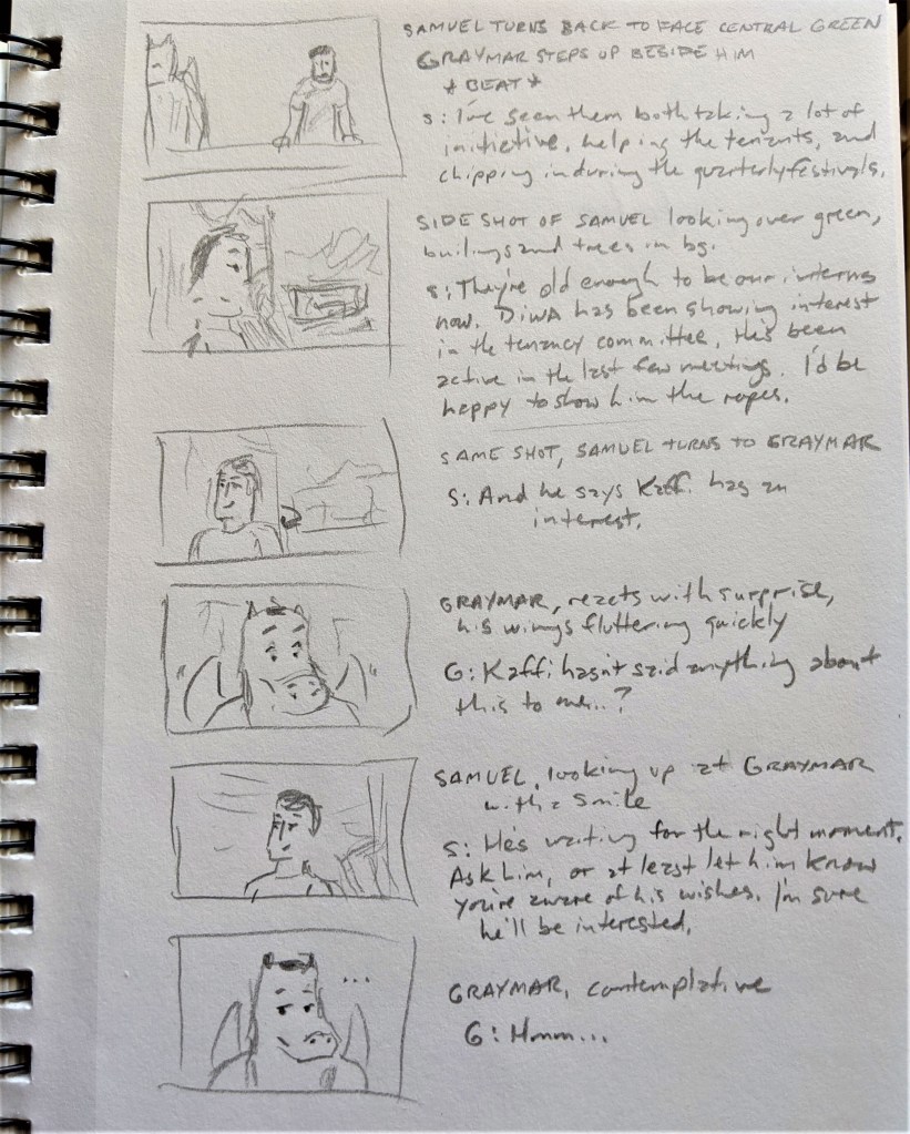 Meanwhile, as a fun not-entirely-serious project to get back into the habit of drawing again (and maybe, slowly, getting better at it), I’ve decided to storyboard Diwa & Kaffi, which is one of my more visually-created stories. I wrote it fully seeing it as a Studio Ghibli film or a manga tankobon, so it certainly lends itself to that particular format.