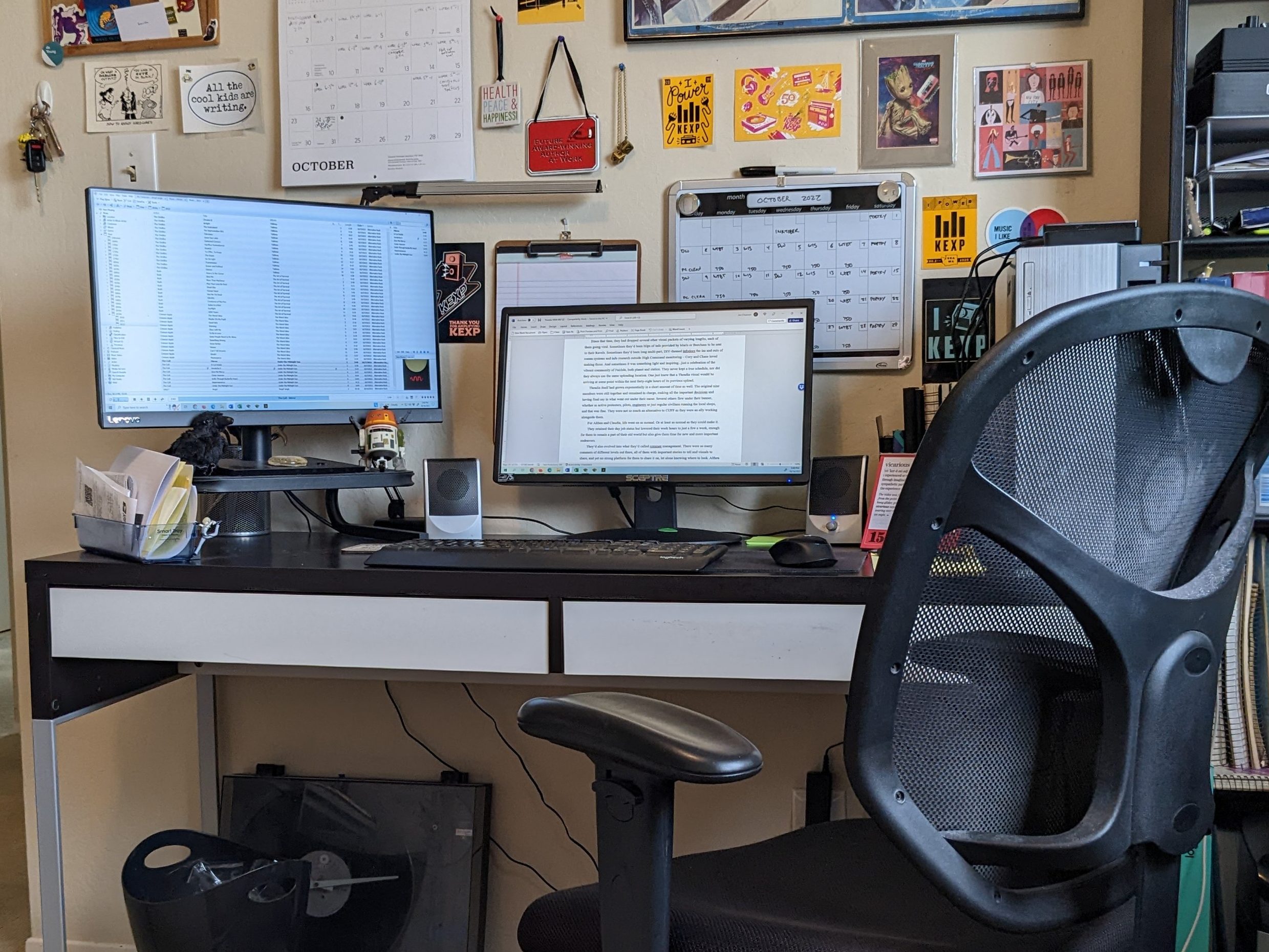 You’ll notice I don’t have the whiteboard schedule up at all. It’s currently sitting somewhere on the tall black bookshelf (now to the left of my desk, as seen in the picture) alongside the two dollar bulletin board I also haven’t used in a while. Part of the fresh start was to do without the whiteboard for a bit, and I think it’s fair to say I don’t really need it at this point. My blogging schedule hasn’t changed over multiple years and I’m just that type of slightly-overprepared person where it’s cemented in my mind now.
